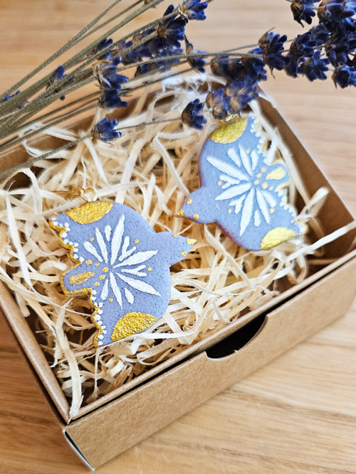Kõrvarõngad on valmistatud polümeersavist ning kaunistatud käsitsi maalitud etnomotiividega, kasutades kvaliteetset akrüülvärvi. Iga detail on hoolikalt läbimõeldud, et luua ehe, mis on ühtaegu pilkupüüdev ja tähenduslik.